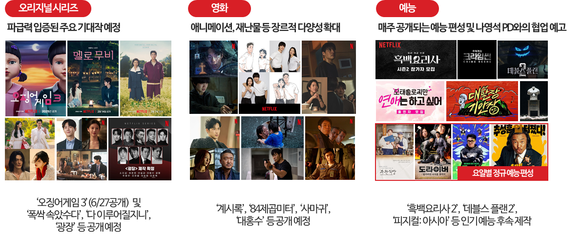 2025년 공개 예정작은 영화, 애니메이션, 재난·범죄물 등 장르적 스펙트럼을 넓히고, 예능 부문에서도 매주 신작을 공개해 꾸준히 이용자를 붙잡는 전략을 택했습니다. <주관식당>, <도라이버> 등 요일별 정규 예능 편성을 통해 이용자들의 일상적인 시청을 유도하려는 전략인데요. 콘셉트에 충실하고 장르적 재미가 강했던 기존의 넷플릭스 오리지널 예능 프로그램과는 다소 다르게, 일일 예능의 경우 짧고 가볍게 즐길 수 있는 일상적인 소재로 구성되어 있는 점도 눈에 띕니다. 이번 변화는 방송사가 주도해 온 일상 예능 프로그램의 영역에 OTT가 진출한 셈인데요. 매주 정해진 요일과 시간에 새로운 에피소드를 공개하는 기존 방송사 예능 방식을 차용함으로써 플랫폼의 콘텐츠 공개 방식에서도 그 경계가 사라지는 모습입니다.