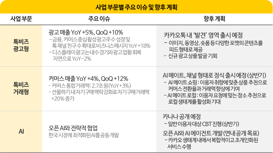 올해 카카오는 ‘카카오톡’ 중심의 B2C AI 서비스 확대에 속도를 낼 계획이에요. 상반기, 카카오톡 채널 형태의 AI 메이트를 출시하고, 오픈AI와 협력한 AI 기반 기능을 단계적으로 도입할 계획입니다.