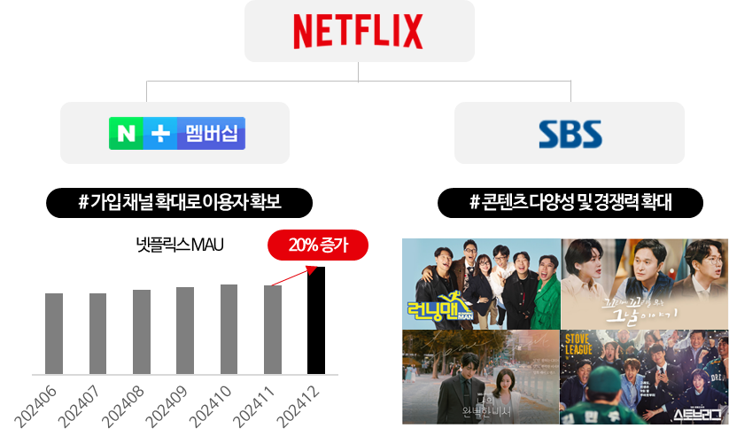 요즘 OTT 시장의 전략 키워드는 '제휴'라 할 수 있습니다. 넷플릭스는 2024년 11월, 네이버의 멤버십 서비스 '네이버플러스 멤버십'과 손을 잡았습니다. 제휴 이후 12월, 넷플릭스 MAU가 20% 증가하기도 했는데요. 넷플릭스는 네이버 멤버십 이용자에게 넷플릭스 광고형 요금제 이용권을 제공하며 국내 광고형 요금제의 가입 경로를 늘리고자 했습니다. 넷플릭스는 여기에 SBS와의 제휴를 통해 SBS의 인기 콘텐츠를 추가하며 콘텐츠 라인업을 넓히고 일상적인 시청 패턴 강화에 힘쓰는 모습입니다. OTT 경쟁이 이제 콘텐츠 자체보다 어떻게 더 쉽게 접근시키고, 자주 보게 하느냐로 변하고 있는 거예요.
