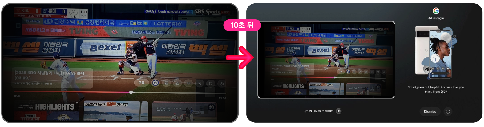- 영상 재생 중 일시정지를 누른 순간 광고 노출, 정지하는 동안 광고가 계속 표시되며 영상 재게시 강제 노출 효과