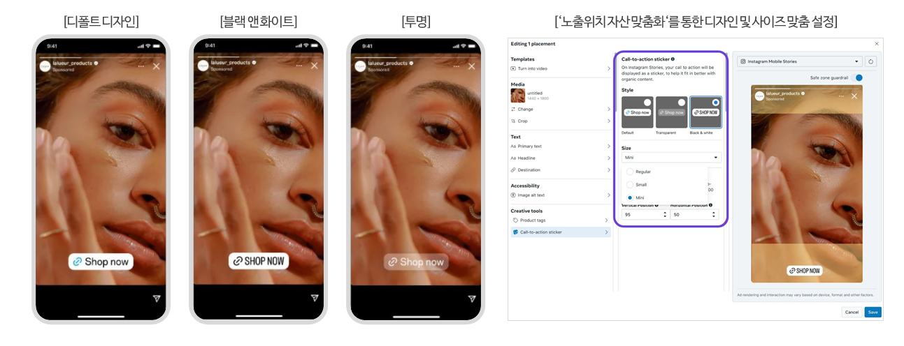 메타가 인스타그램 스토리 CTA 스티커 디자인 맞춤 설정 기능을 도입했습니다. 디폴트 디자인에서 블랙&화이트, 투명 디자인으로 변경이 가능하며, 사이즈 맞춤 설정이 가능합니다. 이를 통해 브랜드 톤앤매너에 맞춘 CTA 노출이 가능해졌습니다.