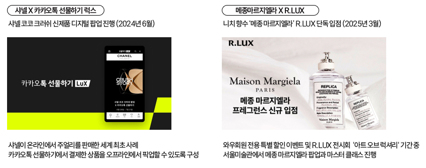 한편, 국내 주요 이커머스 플랫폼들은 차별화된 전략으로 명품 사업을 강화하고 있습니다. 컬리는 2022년 11월 ‘뷰티컬리’를 론칭해 1,000여 개 브랜드 중 30%가 백화점 입점 브랜드로 구성되었으며, 오프라인 페스티벌을 통해 체험과 접점을 확대하고 있습니다. 카카오톡은 2023년 6월 ‘선물하기 LUX’를 도입해 200여 개 글로벌 럭셔리 브랜드를 입점시키고, 단독 제품·전문 요원이 제공하는 프리미엄 서비스 등으로 차별성을 높였습니다. 이어 2024년 10월 쿠팡은 ‘R.LUX’를 선보이며 기존 로켓럭셔리를 독립적인 럭셔리 버티컬 서비스로 개편, 시그니처 패키지와 니치 향수 라인업 강화를 통해 고급화 전략을 강화했습니다.