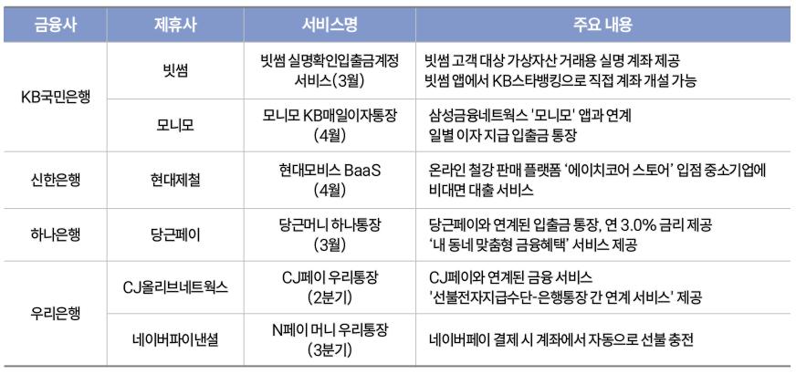 다양한 은행들에서 임베디드 금융 서비스를 추진하고 있는데요! 하나은행은 당근페이와 연계한 '당근머니 하나통장'을 선보이며, 지역 맞춤형 금융 혜택 등 비금융 서비스와 금융을 연결하는 있습니다. 우리은행은 네이버파이낸셜과 제휴하여 선불충전금에 대해 금리와 포인트 적립 혜택을 얻을 수 있는 'N페이 머니 우리통장'을 3분기 내 출시할 예정입니다.
