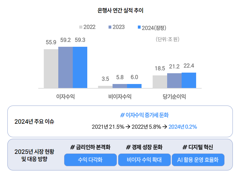 - 은행권: 2024년 역대급 순이익을 기록하며 좋은 성과를 냈지만, 주 수익원인 이자수익의 증가세는 둔화되고 있습니다. 특히 2025년 금리 인하가 예상되는 만큼, 이제는 비이자 수익 확대를 위한 혁신적인 방안을 모색해야 할 때입니다.