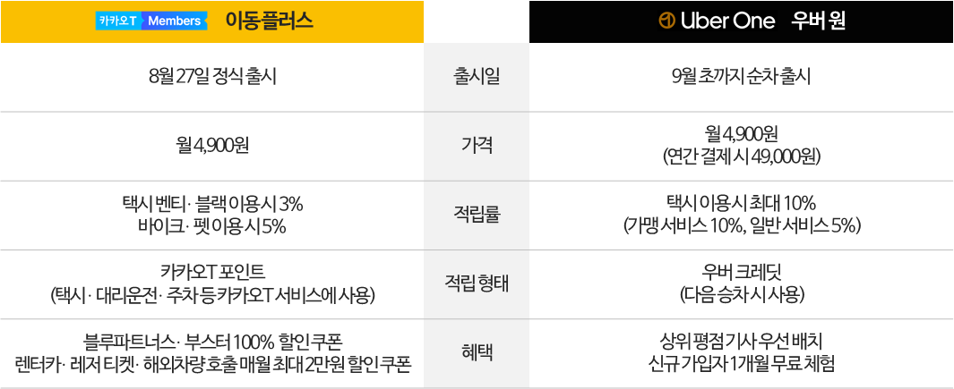 - 카카오모빌리티는 8월에 '카카오T 멤버스'를, 우버 택시는 9월에 '우버 원' 이라는 서비스명의 구독 모델을 출시