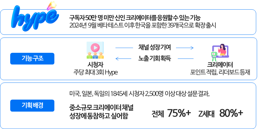 하이프 기능은 중소규모 크리에이터 채널의 성장에 동참하고 싶어하는 이용자들이 늘어남에 따라 기획되었는데요. 미국, 일본, 독일의 1845세 시청자 2,500명 이상을 대상으로 한 설문 결과에서 전체의 75%가 긍정적으로 반응했다고 합니다. 특히, Z세대에선 80% 이상이 중소규모 크리에이터의 성장에 동참하고 싶다고 응답한 점이 눈에 띕니다.