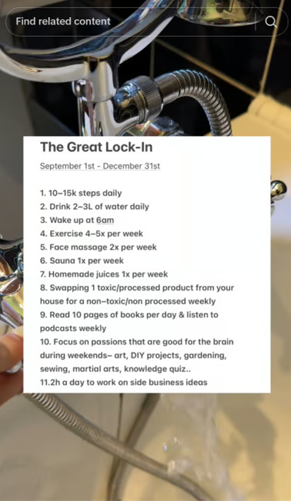 ‘그레이트 락인’은 지금 틱톡을 중심으로 빠르게 확산 중인 연말 자기관리 트렌드입니다. 외부의 방해를 최소화하고, 작지만 의미 있는 목표를 꾸준히 실천하는 것을 핵심으로 합니다. “내년부터 다이어트 해야지”, “새해엔 운동 시작해야지”처럼 미루던 약속을 ‘지금 당장 가능한 루틴’으로 바꾸는 것이죠.