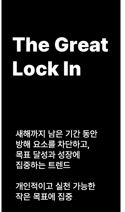 결국, 그레이트 락인은 단순한 연말 챌린지가 아니라, 작은 성취로 자신을 단단히 유지하는 문화적 현상이라고 할 수 있죠.