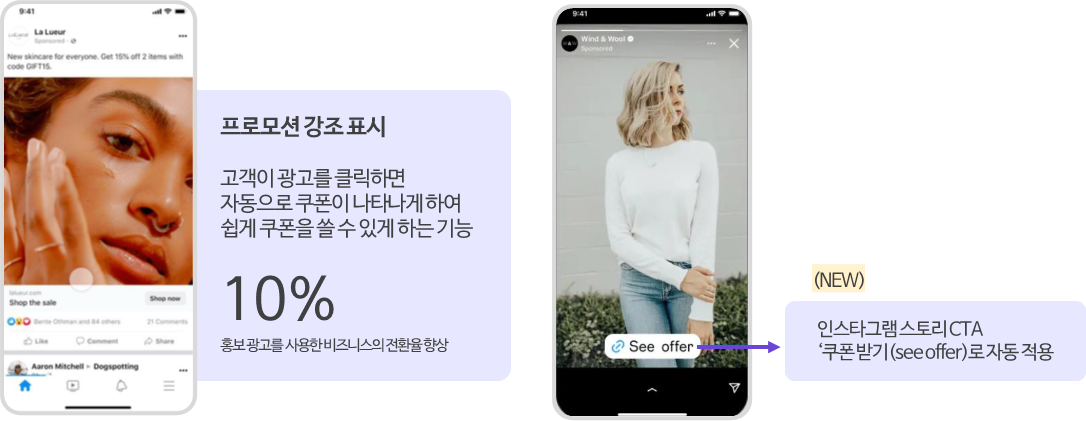 메타가 프로모션 강조하기 기능을 적용한 인스타그램 스토리 광고의 CTA를 자동으로 '쿠폰 받기(See Offer)'로 변경하는 업데이트를 진행했습니다. 11월 11일 50% 롤아웃을 시작해 12월 초 100% 적용될 예정이며 신규 광고뿐만 아니라 기존 프로모션 강조 기능을 사용 중인 광고를 수정·복제할 때도 자동 반영됩니다.