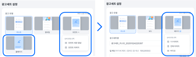 토스가 DA(배너) 광고에서 썸네일 배너 용어를 '보드'로 변경하고, 모먼트·풀페이지 배너 광고 유형이 '페이지' 유형으로 통합됩니다. 모먼트 이미지는 페이지>1:1 이미지로, 풀페이지 이미지는 페이지> 전체 이미지로, 모먼트 세로 영상은 페이지>비디오에서 선택할 수 있습니다.