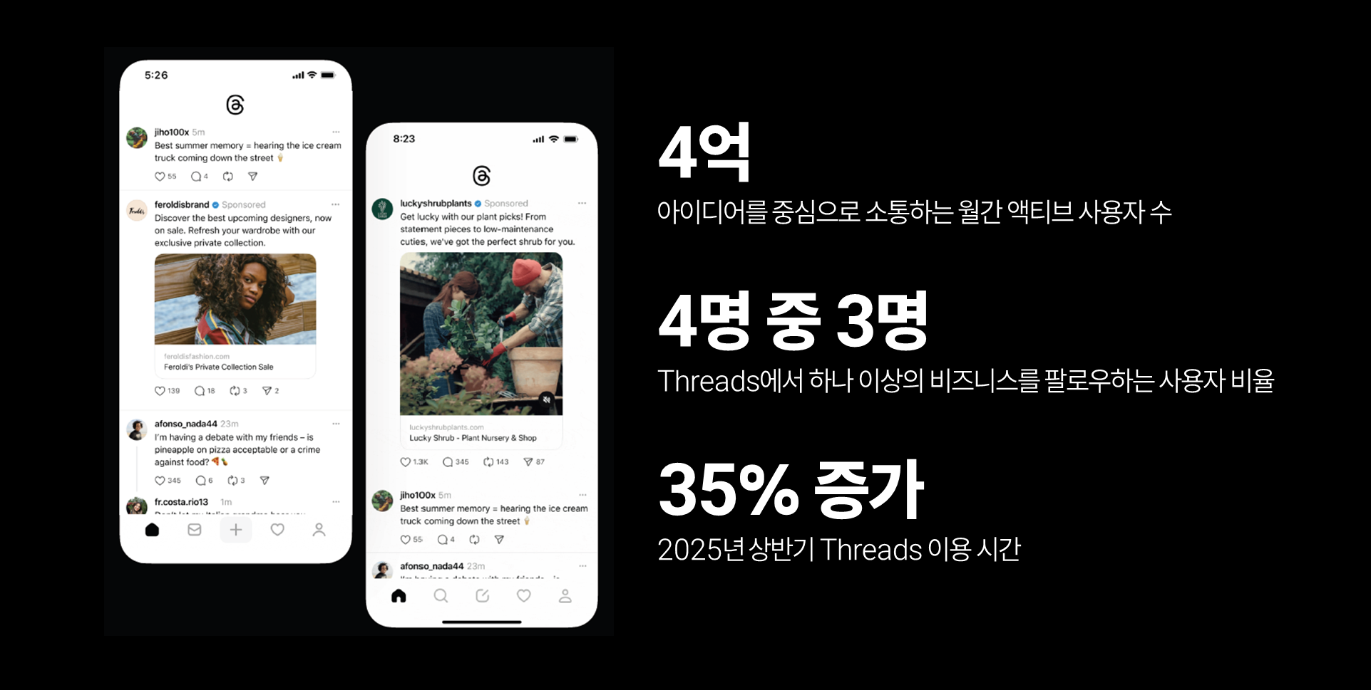 스레드는 월간 활성 사용자 4억 명을 넘었고(2025년 8월 기준), 이용자 4명 중 3명이 하나 이상의 비즈니스 계정을 팔로우하고 있다고 합니다. 특히 스레드의 이용 시간이 전년 대비 35% 증가했다는 점은, 텍스트 기반의 탐색이 다시 힘을 얻고 있다는 신호로 볼 수 있죠.