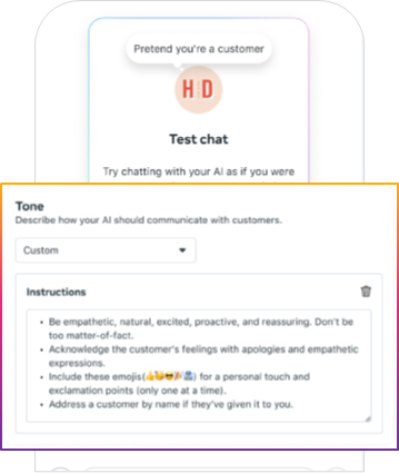 메타가 함께 소개한 '비즈니스 AI'는 브랜드 톤을 학습한 AI가 메타 플랫폼 안에서 DM으로 고객과 소통할 수 있도록 지원합니다. 브랜드 톤을 설정하고, AI와 사람이 각각 다루어야 할 주제를 구분해 직접 설정함으로써 브랜드와 소비자의 대화를 더욱 개인화하고 효율적으로 운영할 수 있게 됩니다.