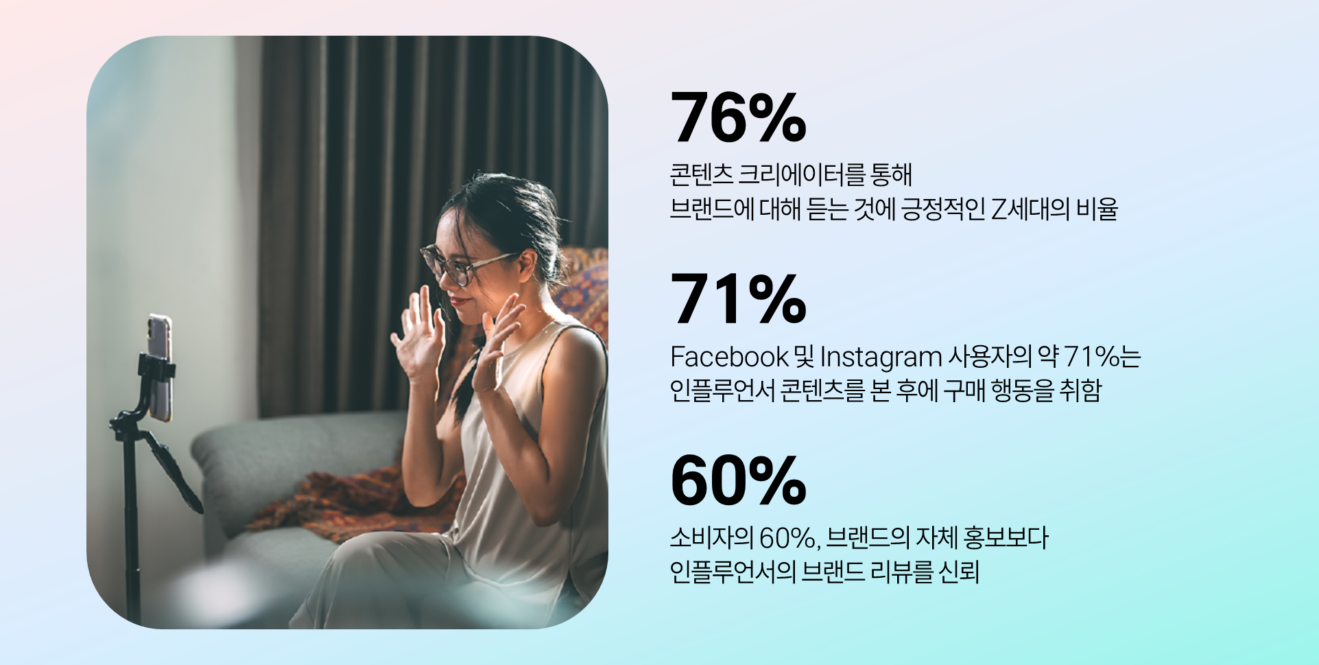 메타가 공개한 자료에 의하면 콘텐츠 크리에이터를 통해 브랜드에 대해 듣는 것에 긍정적인 Z세대의 비율은 76%에 달하며, 페이스북 및 인스타그램 사용자의 약 71%는 인플루언서 콘텐츠를 본 후에 구매 행동을 취한다고 합니다. 또한, 소비자의 60%는 브랜드의 자체 홍보보다 인플루언서의 브랜드 리뷰를 신뢰한다고 응답했습니다.