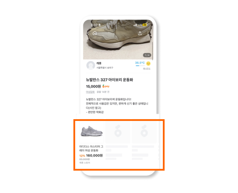 리타겟팅이 적용된 상품이 이제 제품 상세 페이지에만 머무르지 않고, 당근에서 주목도가 가장 높은 홈피드 지면에까지 함께 노출되게 되었습니다.