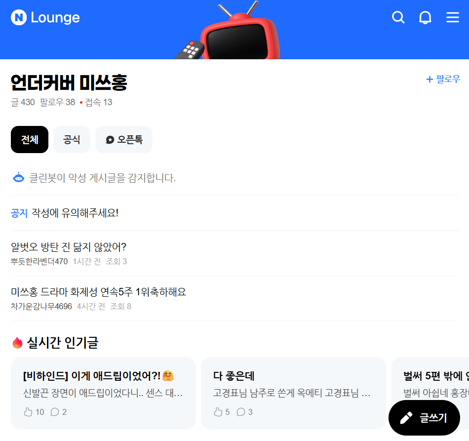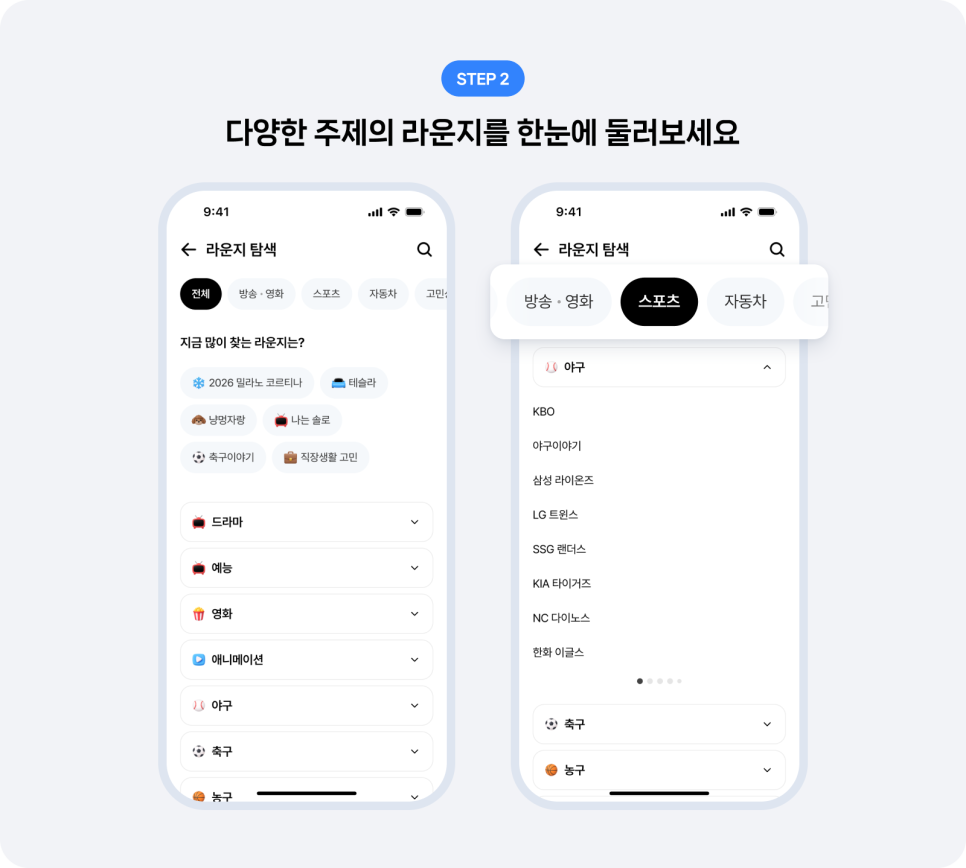 조금 더 세부 주제가 궁금하다면 상단 카테고리 탭을 활용해보는 것도 방법이에요. 방송·영화, 스포츠처럼 카테고리를 선택하면 각 카테고리별 라운지를 더 많이 확인할 수 있어요. 원하는 라운지가 이미 정해져 있다면 상단 검색 아이콘으로 빠르게 찾아볼 수도 있답니다.