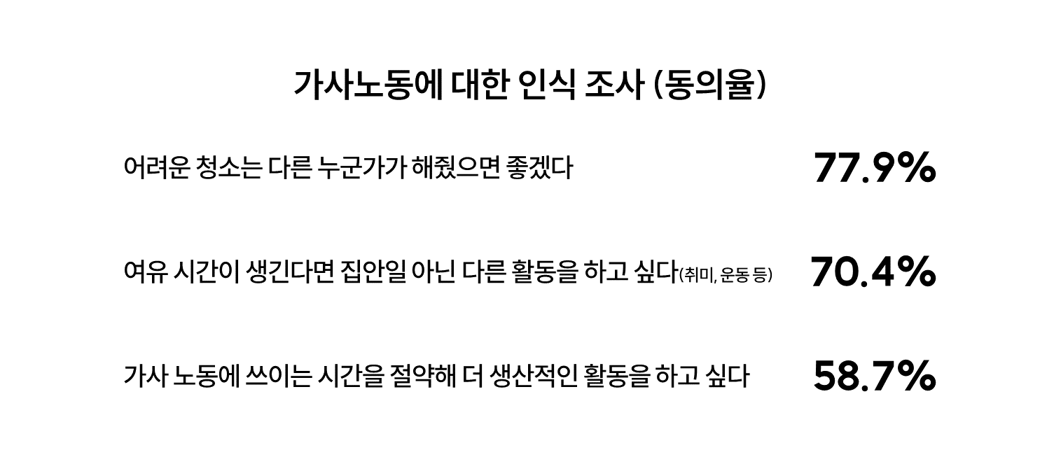 성인남녀를 대상으로 한 설문조사에서도 열 명 중 여덟 명이 '어려운 청소는 남이 대신 해주면 좋겠다'라고 답할 만큼, 이제 집안일은 내가 무조건 안고 가야 하는 숙제가 아니라 전문가에게 비용을 지불하고 맡기는 영역으로 진화하고 있습니다.