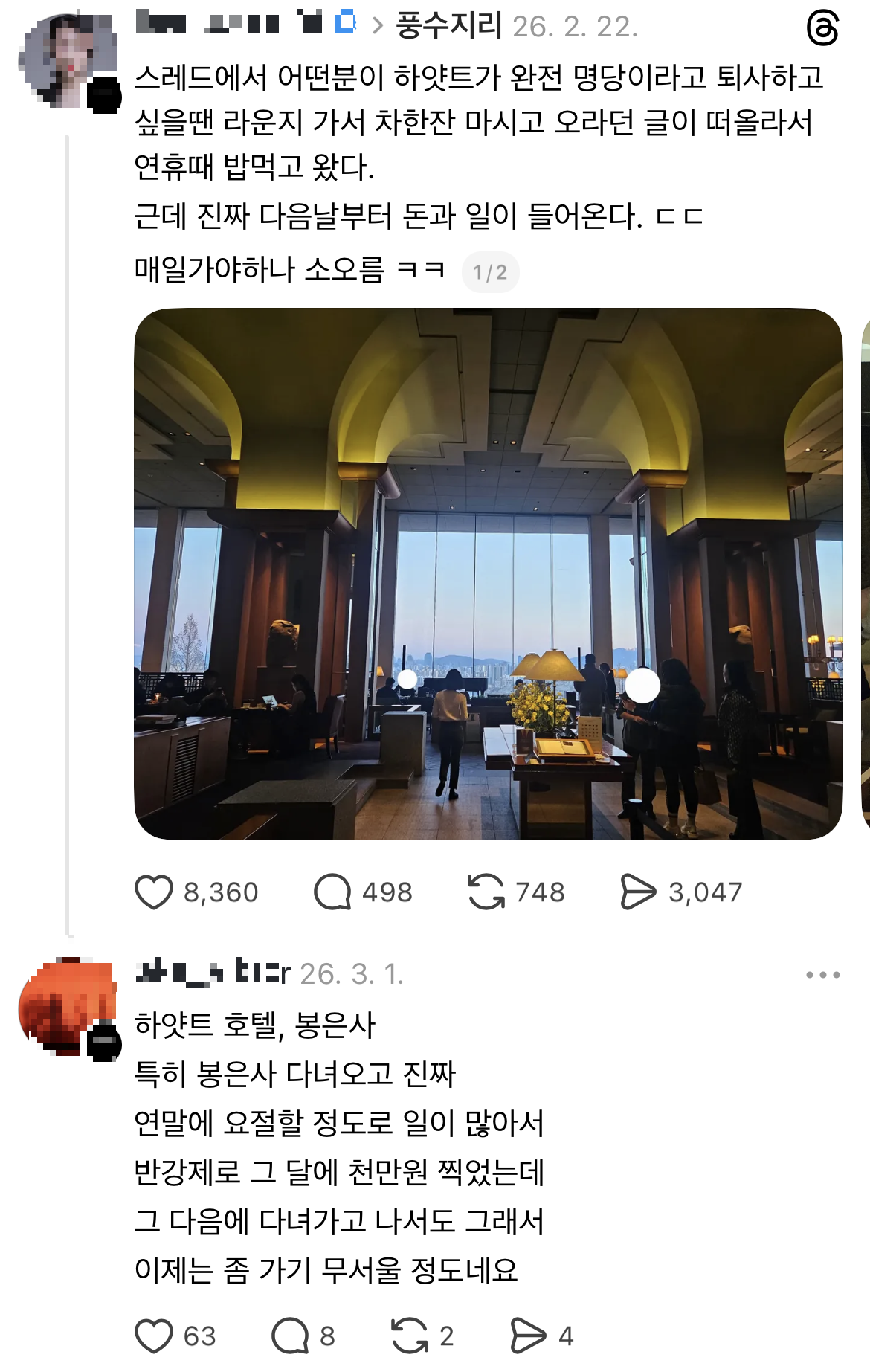최근 인스타그램을 중심으로 그랜드하얏트 서울 라운지를 두고 '커피 한 잔 마시면 일이 들어온다', '화(火)기운이 필요하면 가는 것을 추천한다'라고 말하는 릴스가 퍼지며 풍수지리나 오행에 관심을 갖는 젊은 층도 늘고 있습니다. 특정 공간의 '기운'과 '명당'을 탐방하는 것이 하나의 콘텐츠로 자리 잡은 겁니다. 진지하게 풍수지리를 믿어서가 아니라, 한 번쯤 해보고 싶은 '체험'으로서 말입니다.