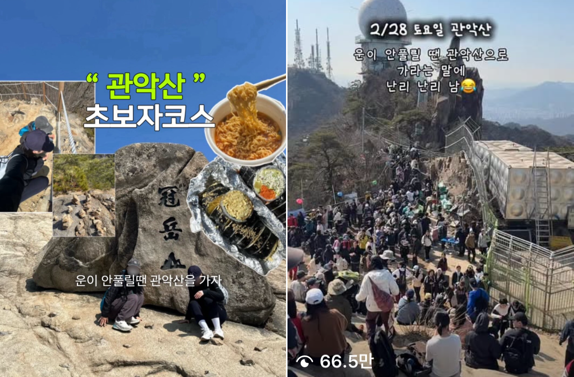 사실 등산은 이미 몇 년 전부터 Z세대의 새로운 취미로 떠오른 바 있었죠. 다만 이번 관악산의 인기는 기존의 등산 유행과는 조금 결이 다릅니다. 단순히 운동이나 인증을 위한 산행이 아니라, 특정 장소에 좋은 기운이 있다는 이야기를 계기로 그 기운을 직접 체감하고 싶어 찾아가는 모습인 게 흥미롭습니다.
